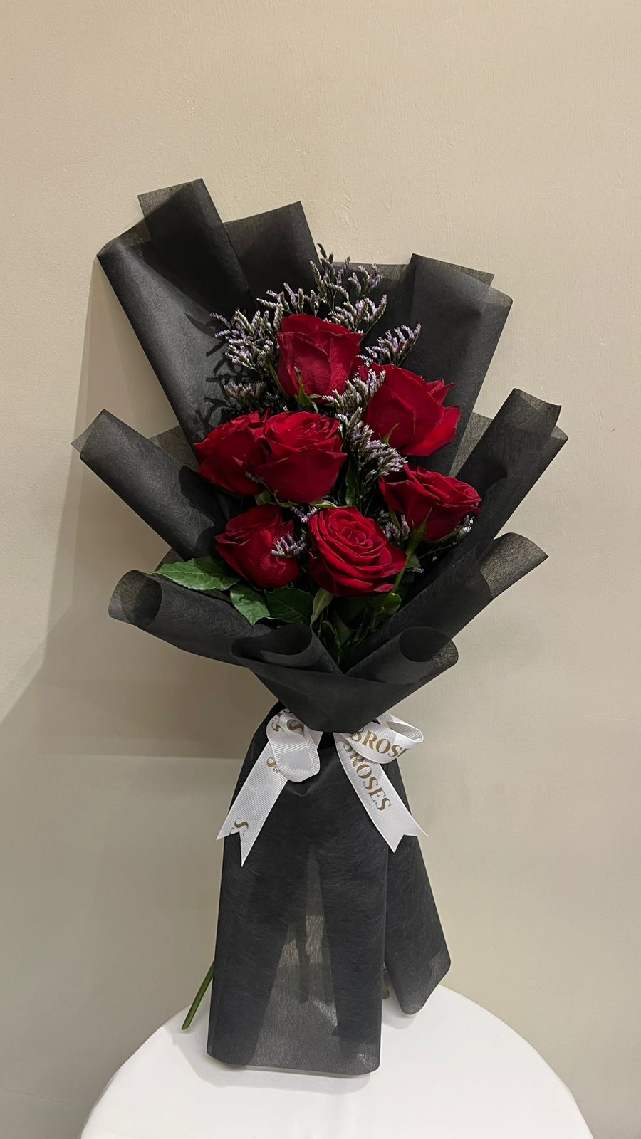 تنسيق كلاسيكي وأنيق من الورود الحمراء الداكنة، مغلف بورق أسود يبرز جمالها وجرأتها. الباقة مزينة بشريط أبيض أنيق لتكون تعبيراً عن الشغف القوي والحب الجريء.