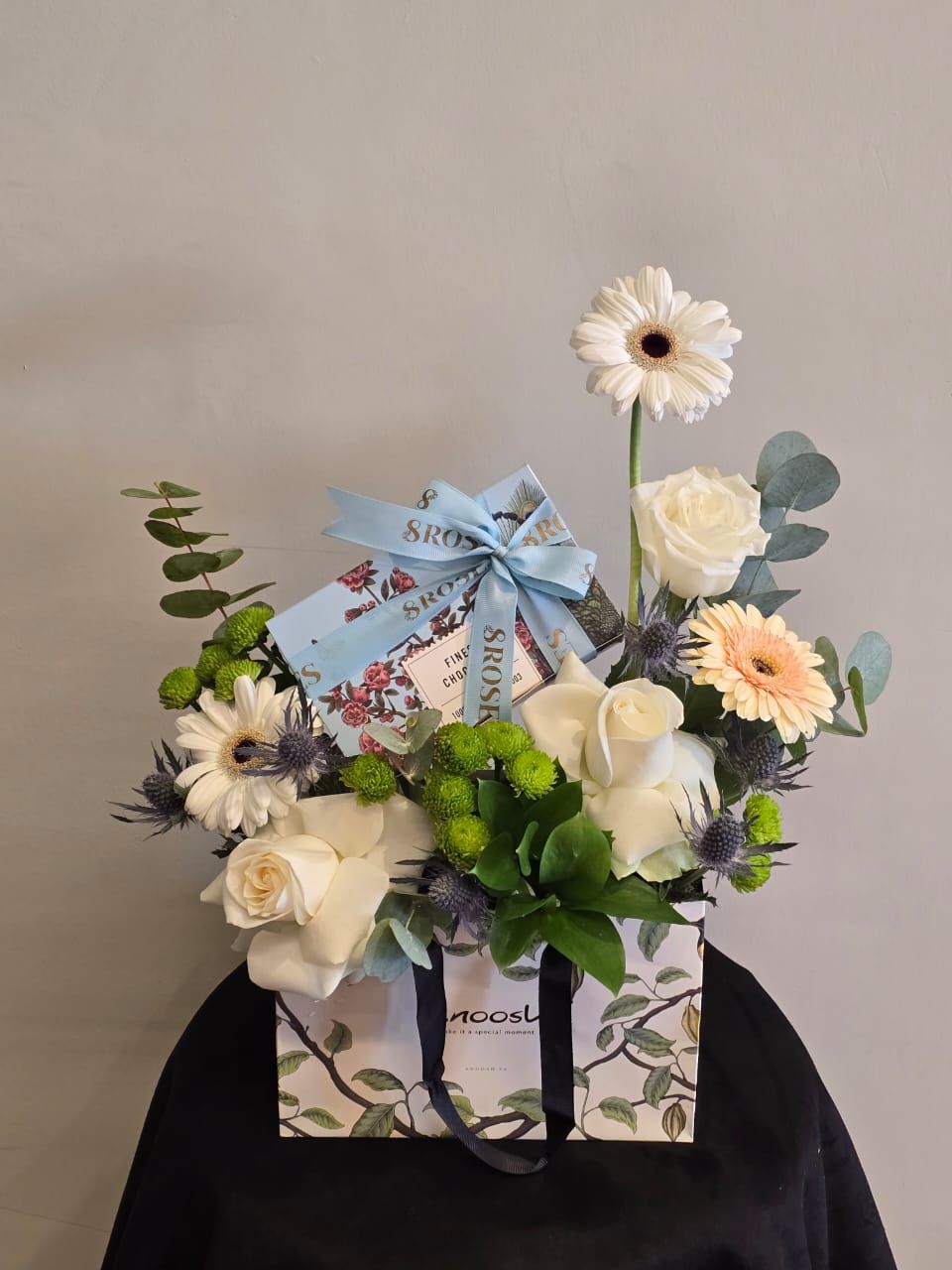 باقة ساحرة تضيء المكان بجمال زهور الجربيرا والروز والأوكالبتوس. هذا التنسيق الفريد مقدم مع صندوق من شوكولاتة “أنوش” الفاخرة بوزن ربع كيلو، ليجمع بين جمال الطبيعة ولذة المذاق.