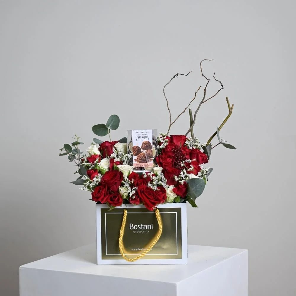 يجمع كيس بستاني الفاخر بين جمال الورد الجوري الأحمر والأبيض وحلاوة شوكولا الحليب بالبسكويت المقرمش الرائعة، هدية مثالية للتعبير عن الحب والمشاعر الصادقة.