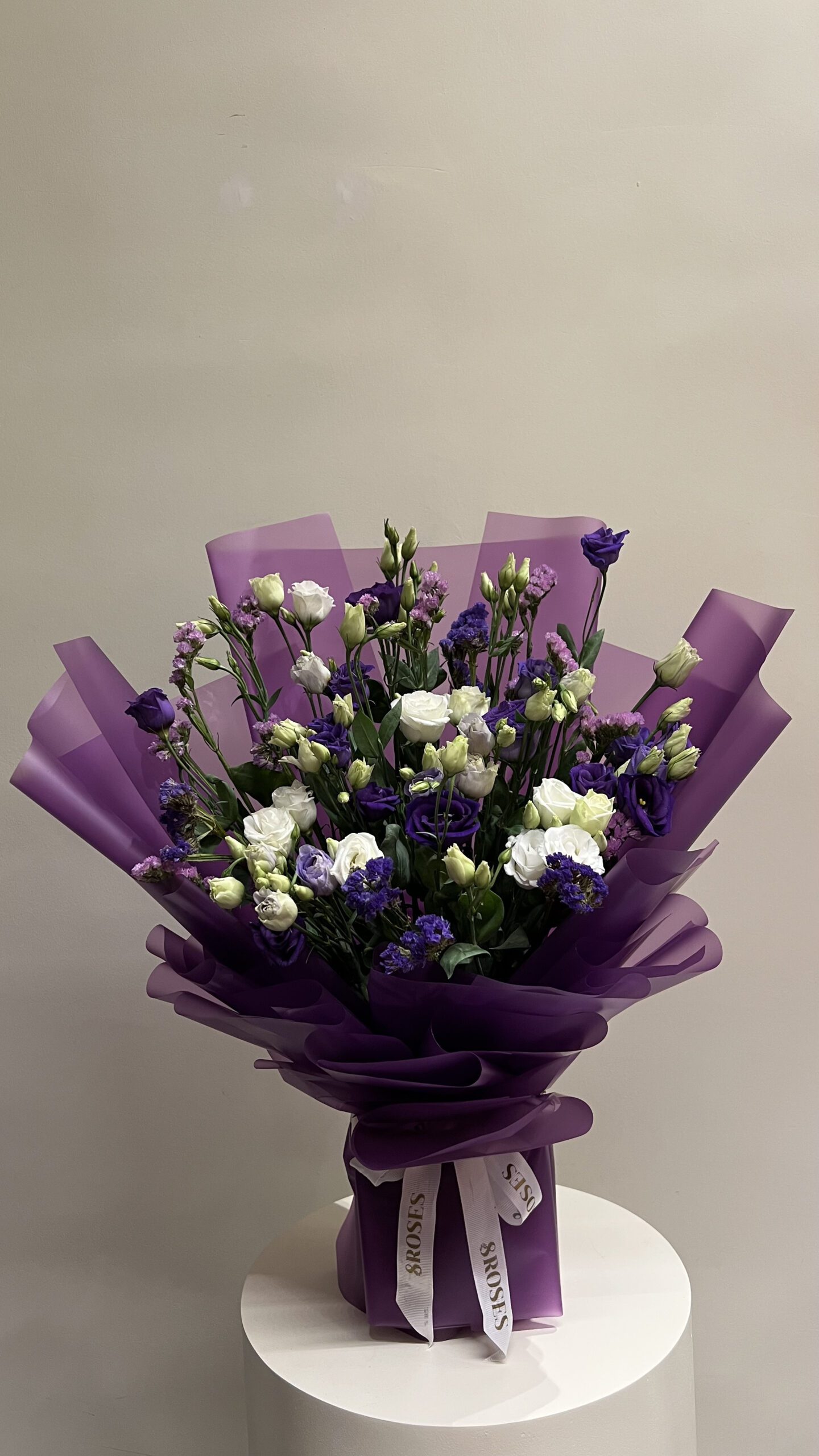 باقة جميلة بتناغم ساحر من الورد الهولندي، الاستوما، والستاتس، حيث تنساب أزهارها البيضاء والبنفسجية، وهي ملفوفة بتغليف بنفسجي فاخر يبرز جمالها.”