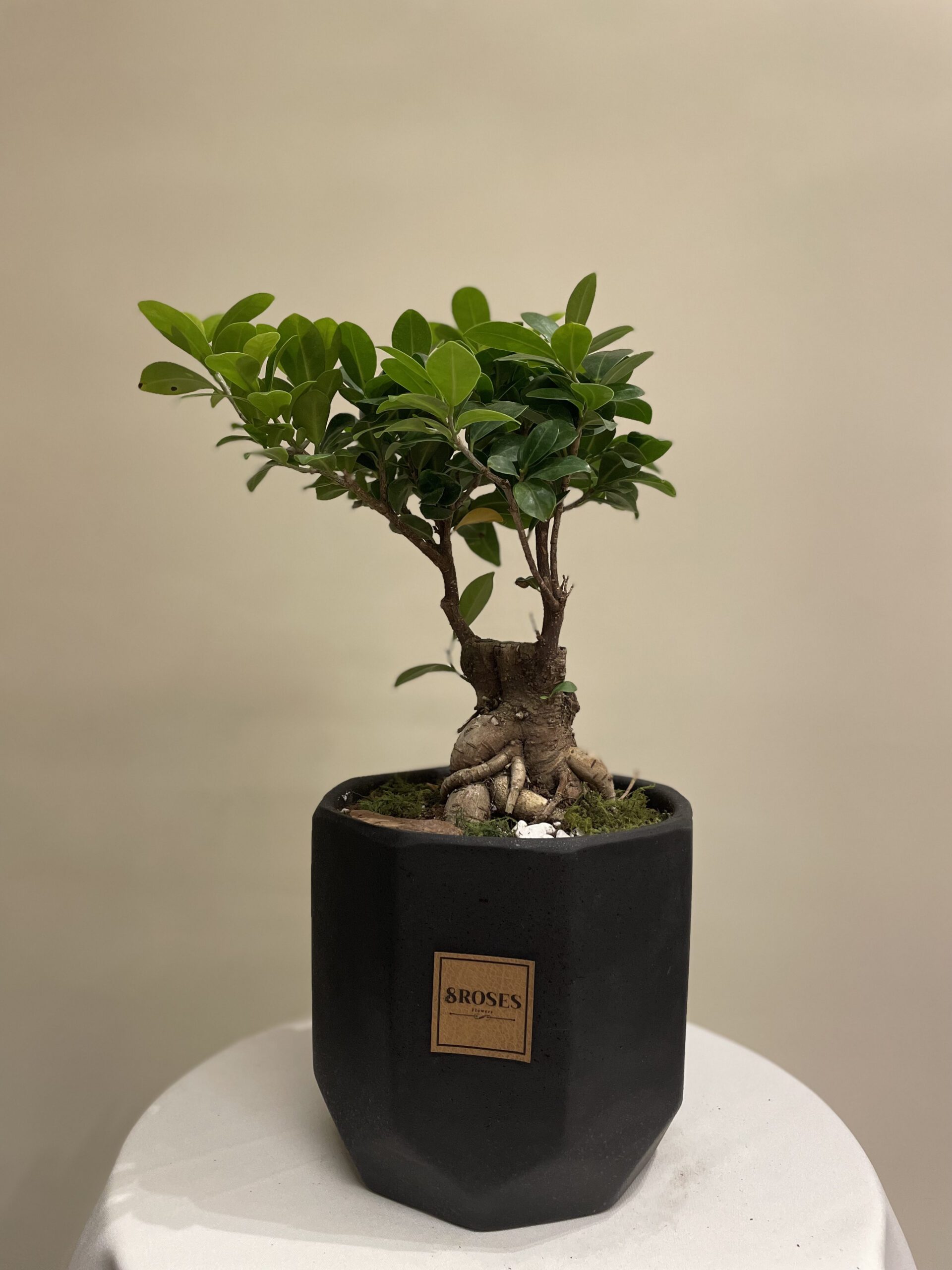 أضف لمسة من الهدوء والجمال الطبيعي إلى مساحتك مع شجرة البونساي الصغيرة هذه. تتميز هذه النبتة المصغرة بأوراقها الخضراء اليانعة وجذعها المتين الذي ينمو برشاقة في وعاء أسود أنيق سداسي الشكل.