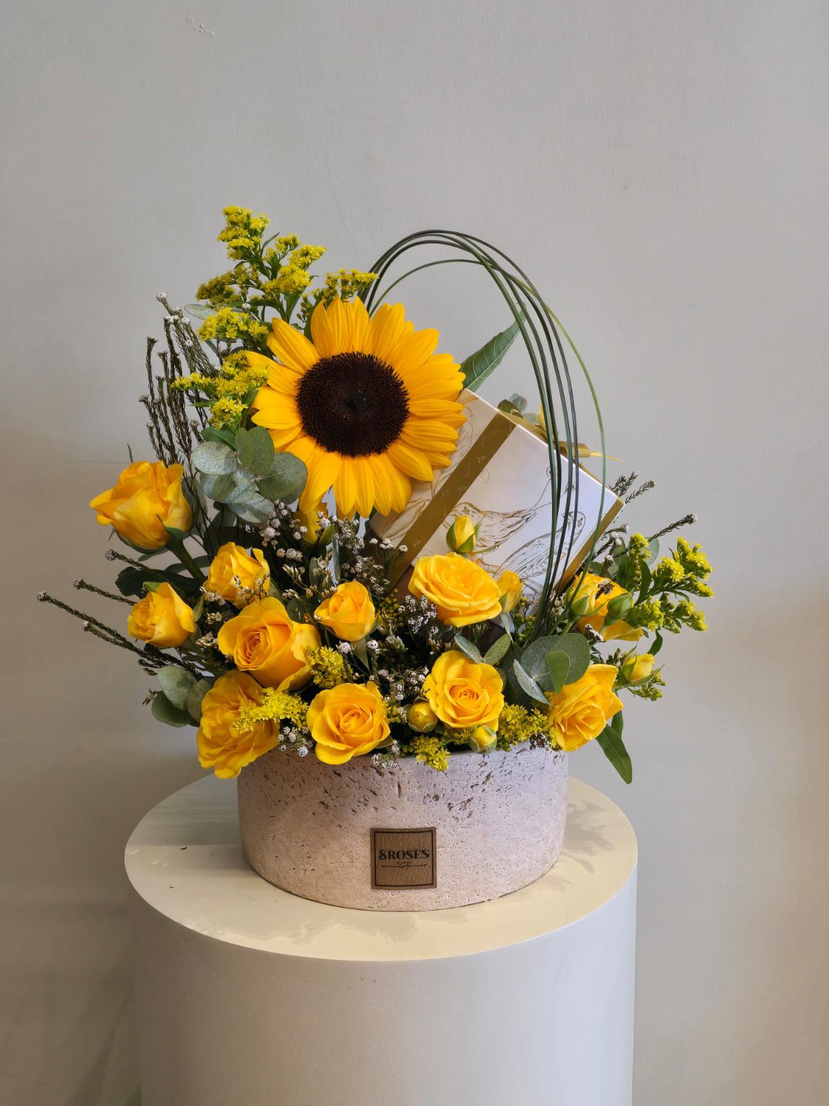 تنسيق يجسد أناقة الورد ولذة الشوكولاتة، يجمع بين جمال زهور عباد الشمس والبيبي روز الأصفر النابض بالحياة، ويُقدم في قاعدة حجرية دائرية أنيقة. يكتمل التنسيق بصندوق شوكولاتة من “أنوش” بوزن 500 جرام، يضم تشكيلة مميزة من النكهات اللذيذة مثل التوفي بالحليب مع اللوز المكرمل.”