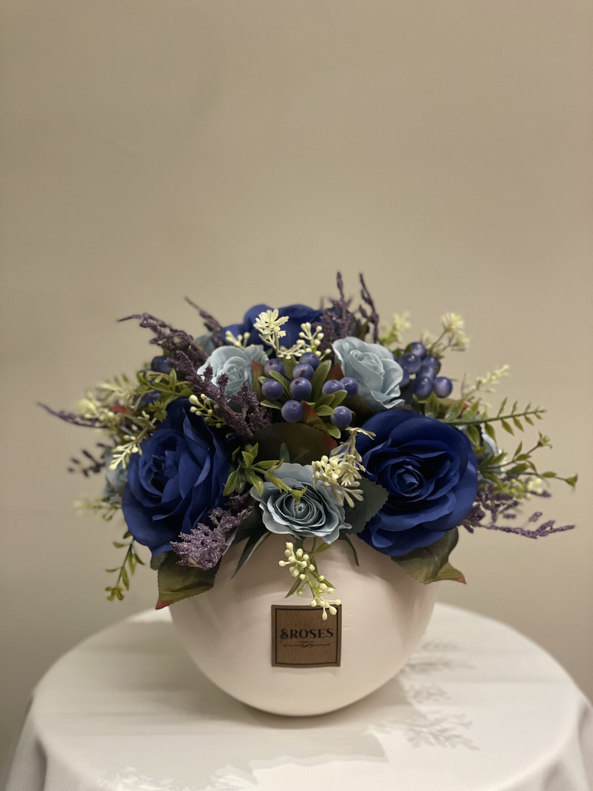 فازة أنيقة وتنسيق أزرق صناعي لا يذبل جماله، تُضفي لمسة جمالية على أي مكان.
