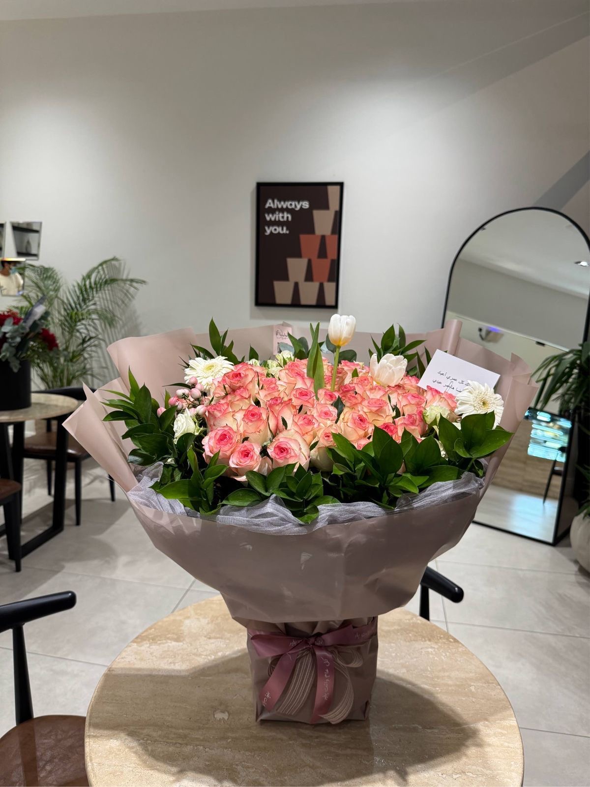 باقة ورد وردي وأبيض مع بطاقة رومانسية.