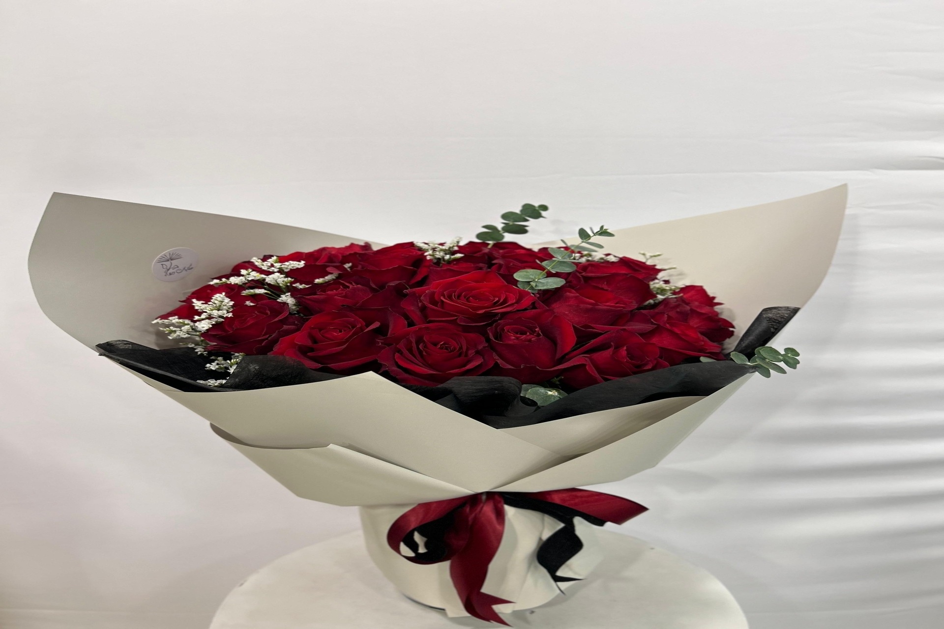 باقة فاخرة تضم 25 وردة حمراء طبيعية مرتبة بعناية مع لمسات من الزهور البيضاء وأوراق خضراء، مغلفة بتغليف أنيق مع شريط ساتان أحمر وأسود 🎁🌹.