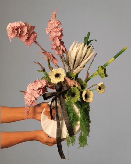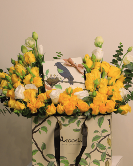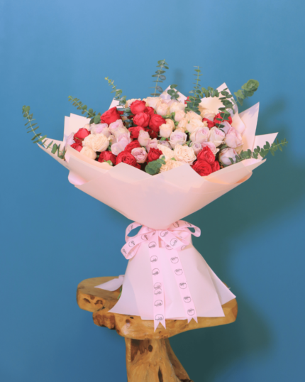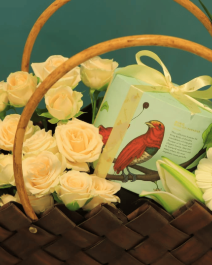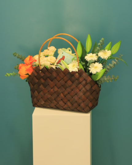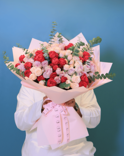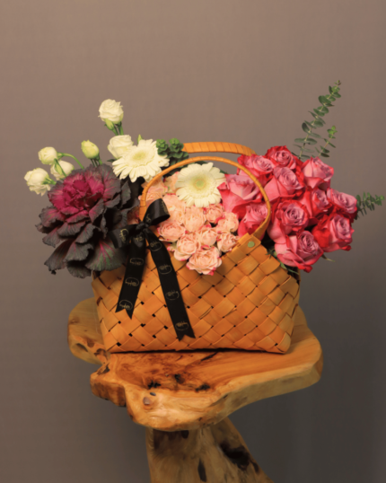 نسيق أنيق يجمع بين ألوان الورد الجوري الوردي والفوشي مع لمسات من الزهور البيضاء وأوراق الزينة الطبيعية. تصميم فريد داخل سلة خشبية فاخرة ليكون هدية مثالية تعبّر عن الفخامة والذوق الرفيع في كل مناسبة.