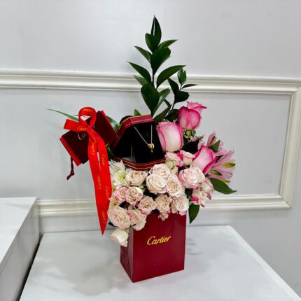 باقة تحتوي على زهور الجوري، البيبي جوري والألستروميريا مع قلادة باللون الذهبي.