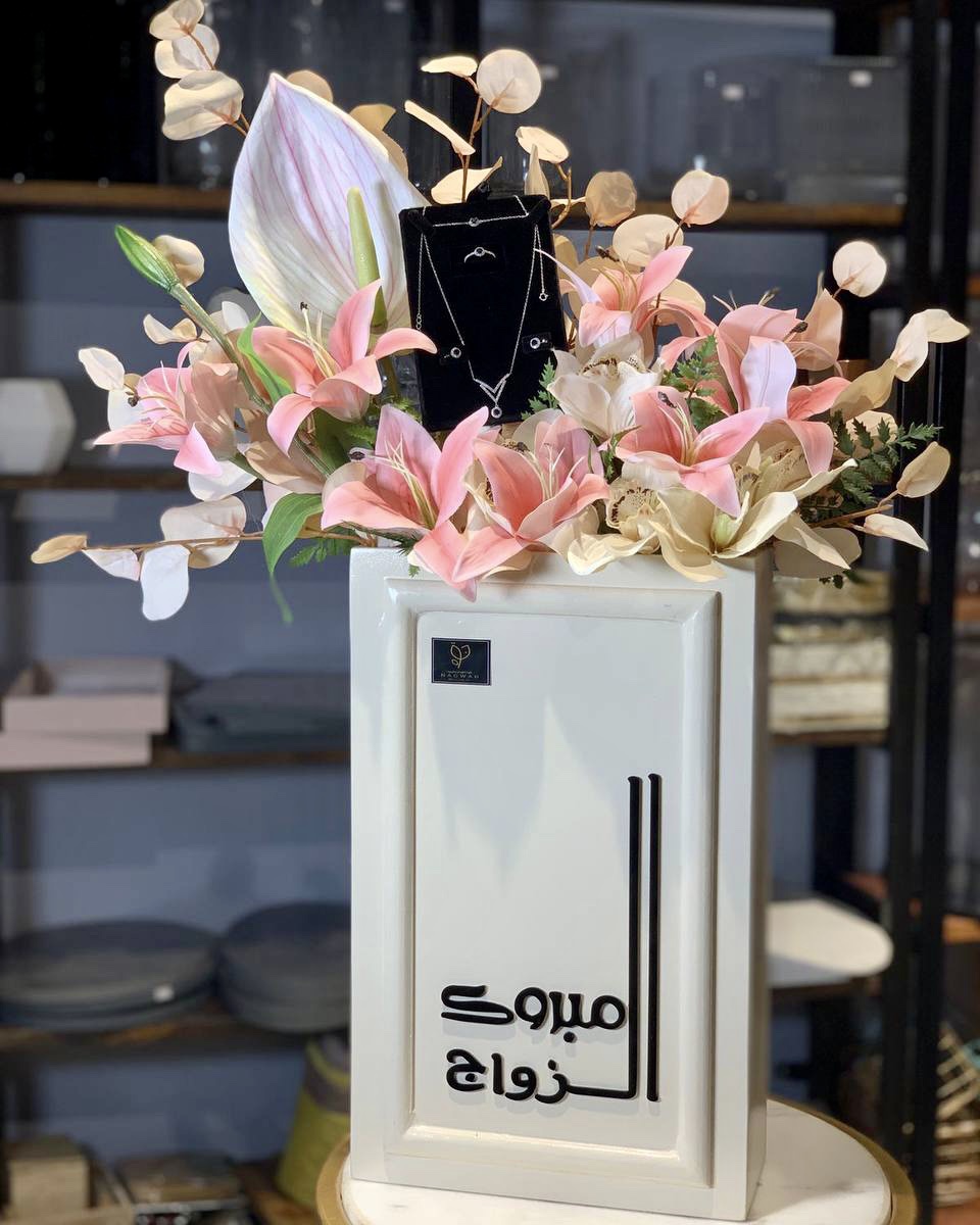 ستاند من الخشب يحتوي على كتابة من الاكريلك عبارة مبروك الزواج ومنسقة بشكل فخم